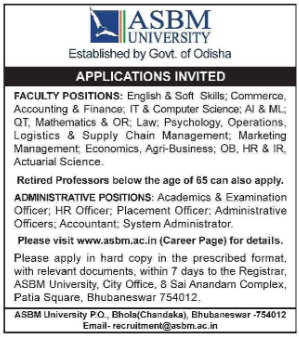 ASBM University Recruitment 2026: ASBM University, Bhubaneswar, established by the Govt. of Odisha, has released a recruitment notification inviting applications for various Faculty and Administrative positions. This is an excellent opportunity for professionals looking to build a career in a prestigious academic environment.