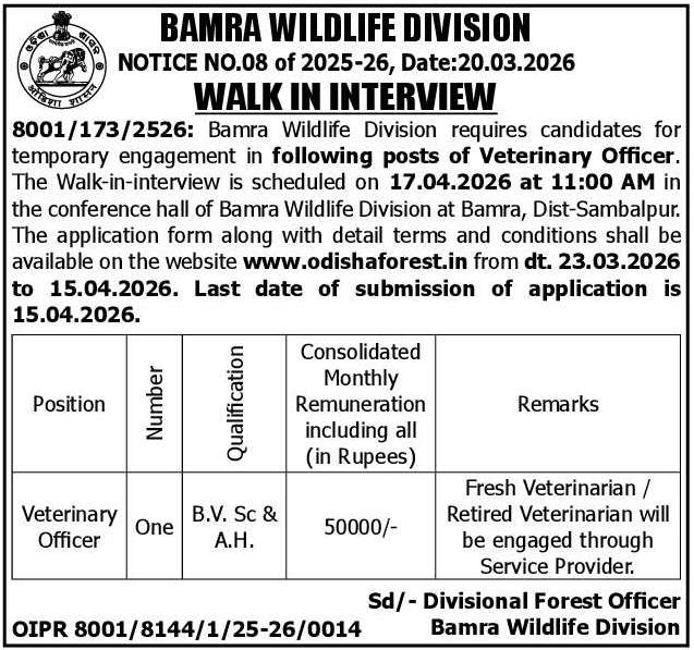 Bamra Wildlife Division Recruitment 2026: Walk-in Interview for Veterinary Officer