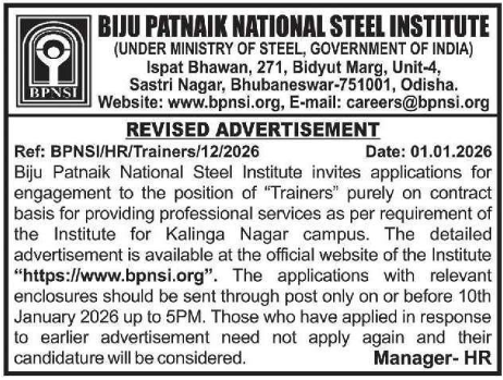 Biju Patnaik National Steel Institute Recruitment 2026: The Biju Patnaik National Steel Institute (BPNSI), under the Ministry of Steel, Government of India, has announced a new Odisha job opportunity for experienced engineering professionals. This recruitment drive aims to fill Trainer positions on a contract basis at their Kalinganagar campus.