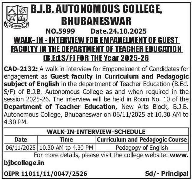 A walk-in interview for Empanelment of Candidates for engagement as Guest faculty in Curriculum and Pedagogic subject of English in the department of Teacher Education (B.Ed. S/F) of B.J.B. Autonomous College as and when required in the session 2025-26. The interview will be held in Room No. 10 of the Department of Teacher Education, New Arts Block, B.J.B. Autonomous College, Bhubaneswar on 06/11/2025 at 10.30 AM to 4.30 PM.