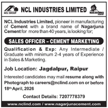Cement Industry Jobs Chhattisgarh 2026: NCL Industries Limited, a pioneer in the manufacturing of cement under the well-known brand Nagarjuna Cement for over 40 years, is inviting applications for the position of Sales Officer. This is a great opportunity for professionals looking for the latest jobs in Chhattisgarh and interested in joining a reputable organization in the building materials industry.