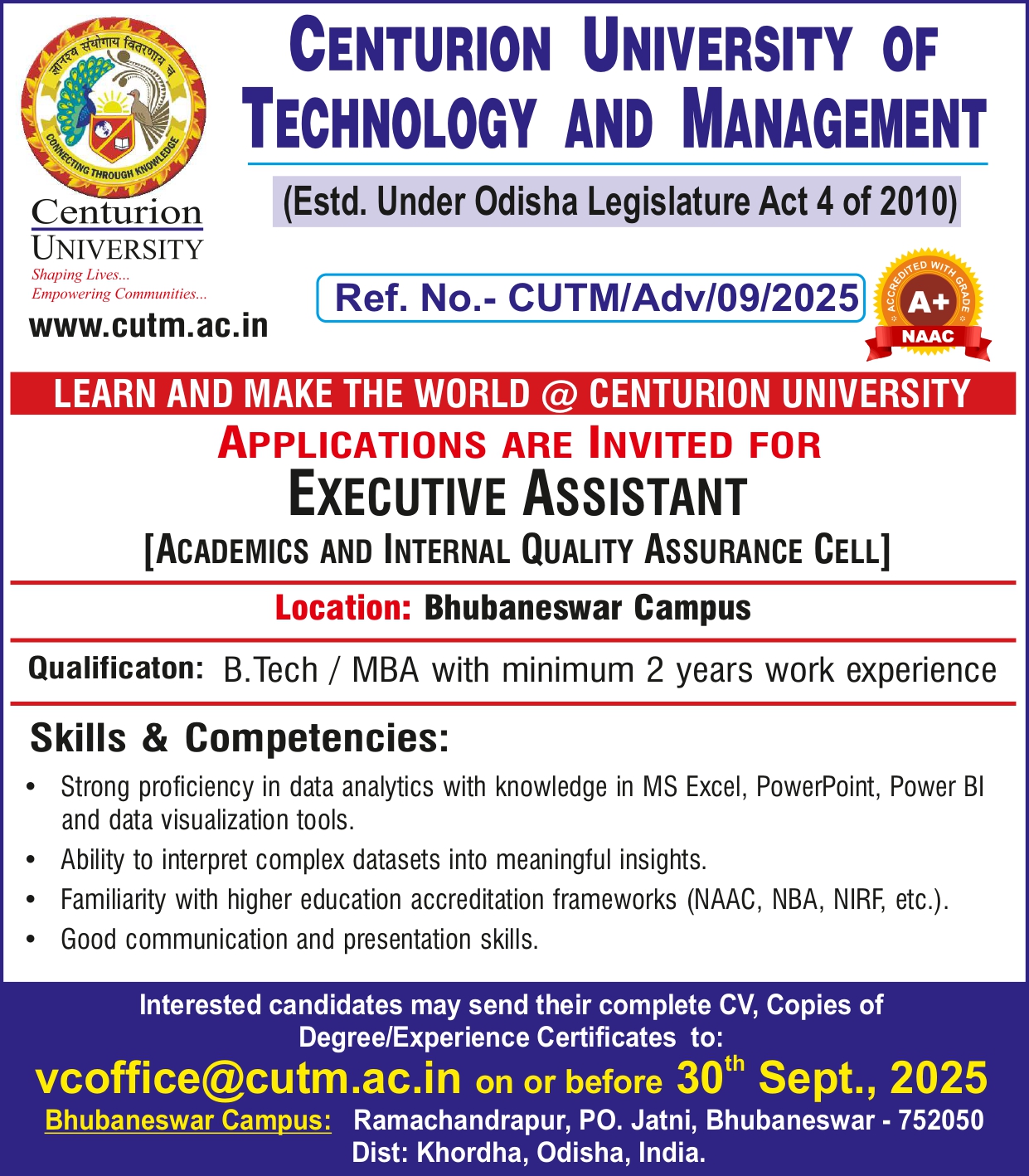 Centurion University of Technology and Management (CUTM), a leading institution in Odisha, has invited applications for the post of Executive Assistant in the Academics and Internal Quality Assurance Cell (IQAC) at its Bhubaneswar Campus.