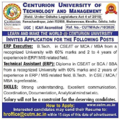 Centurion University recruitment Bhubaneswar 2025: Vacancy for ERP Executive/Technical Assistant (ERP)