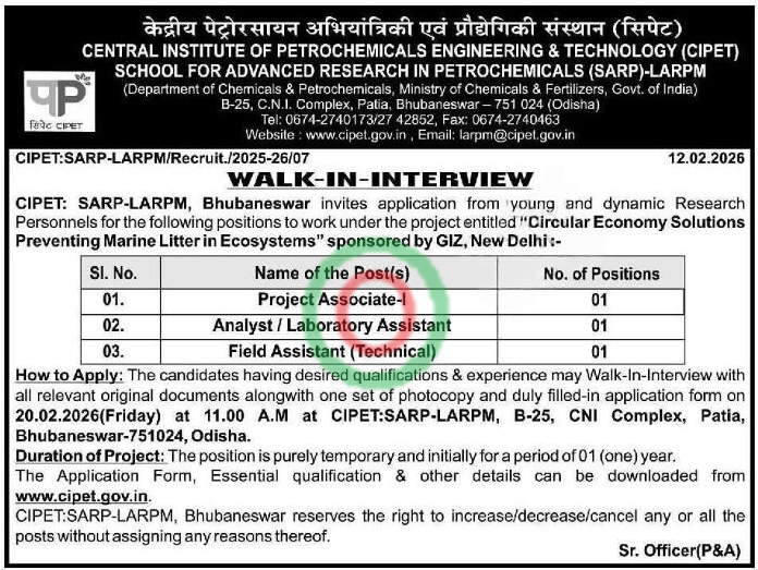 CIPET Bhubaneswar Recruitment 2026: The Central Institute of Petrochemicals Engineering & Technology (CIPET) is looking for dynamic professionals to join its research wing in Odisha. If you are searching for a rewarding Govt job in Odisha, this is an excellent opportunity to work on the project “Circular Economy Solutions Preventing Marine Litter in Ecosystems,” sponsored by GIZ, New Delhi.