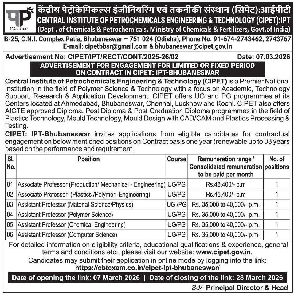 The Central Institute of Petrochemicals Engineering & Technology (CIPET), a premier national institution under the Ministry of Chemicals & Fertilizers, is inviting applications from eligible candidates for contractual engagement at its Bhubaneswar campus. These positions are for a limited period of one year, with the possibility of renewal for up to three years based on performance and institutional needs.