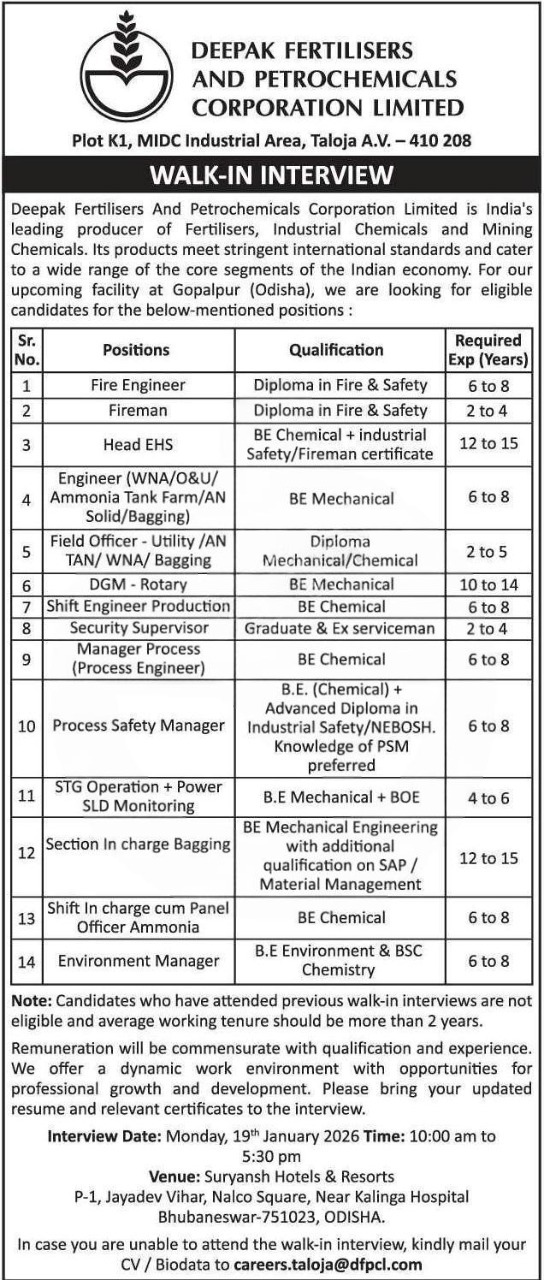 Deepak Fertilisers Odisha Recruitment 2026: Deepak Fertilisers and Petrochemicals Corporation Limited (DFPCL), a leading Indian producer of fertilisers, industrial chemicals, and mining chemicals, is expanding! To support their upcoming facility in Gopalpur, Odisha, they are hosting a walk-in interview for several key technical and managerial positions.