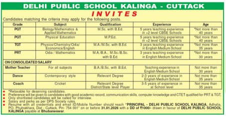 DPS Odisha Recruitment 2026: Vacancy at Delhi Public School (DPS) Kalinga Cuttack-PGT/TGT/PRT/Dance/ Coach