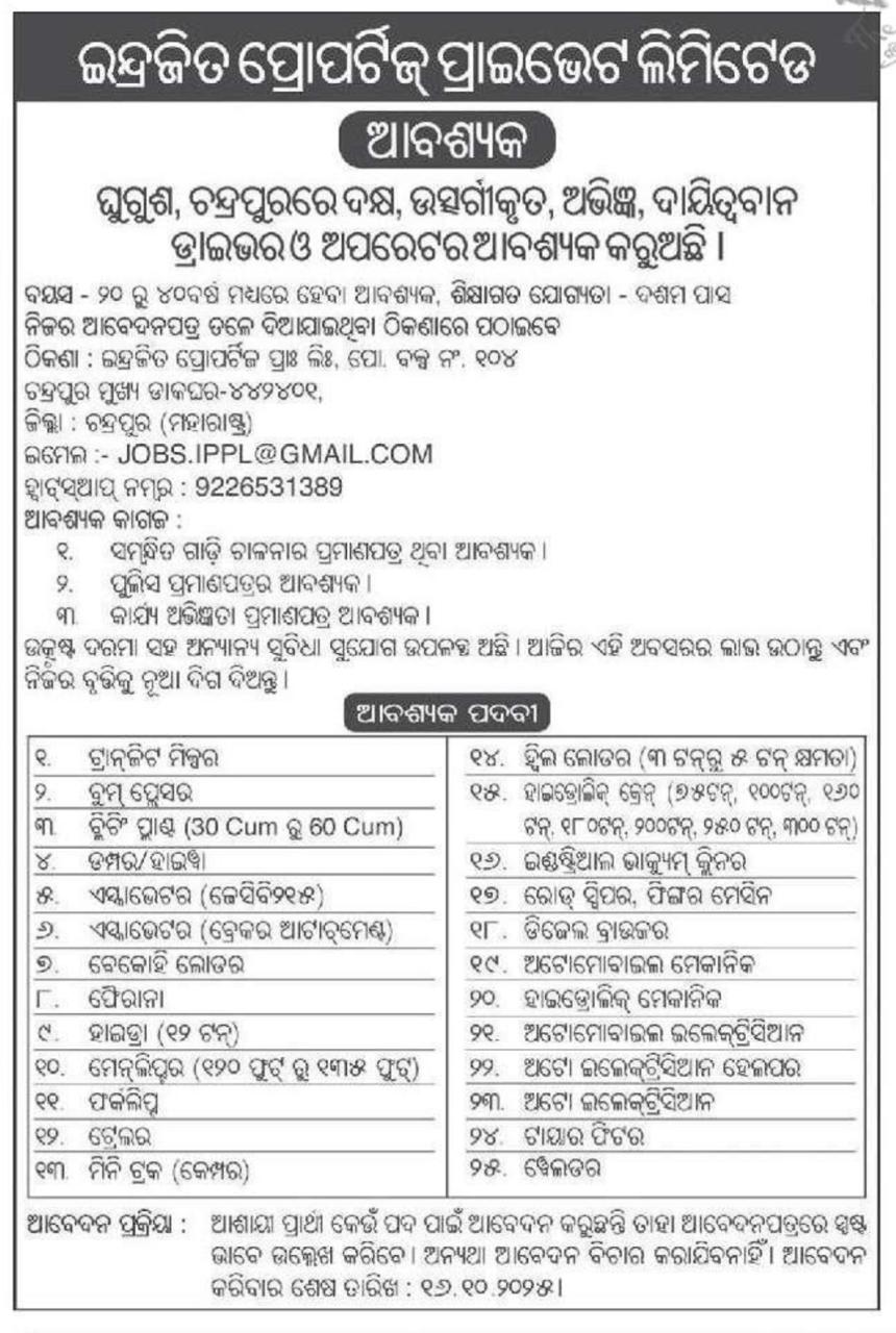 Indrajit Properties Private Limited requires Skilled, Dedicated, Experienced, and Responsible Drivers and Operators for its operations in Ghugus and Chandrapur (Maharashtra).