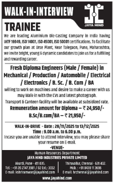 Jaya Hind Industries Trainee Recruitment (Walk-in Interview)