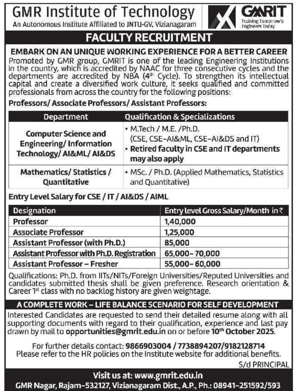 How to apply: Interested Candidates are requested to send their detailed resume along with all supporting documents with regard to their qualification, experience and last pay drawn by mail to opportunities@gmrit.edu.in on or before 10th October 2025.