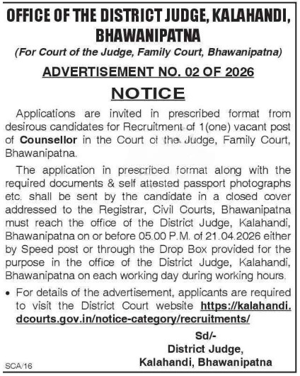 Family Court Kalahandi Recruitment 2026: The Office of the District Judge, Kalahandi, Bhawanipatna has released a recruitment notification (Advt. No. 02 of 2026) for the position of Counsellor in the Family Court. This district court Kalahandi recruitment offers a professional opportunity for qualified individuals to serve within the judicial system.