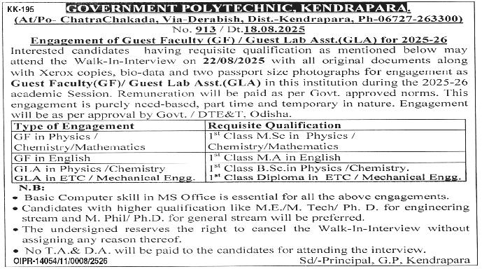 Govt Polytechnic Odisha Recruitment 2025: Recruitment for the position of Guest Lab Assistant and Guest Faculty at Govt Polytechnic Kendrapara