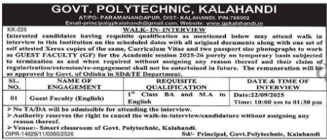 Government Polytechnic, Kalahandi is inviting eligible candidates to attend a walk-in interview for engagement as Guest Faculty (English) for the academic session 2025-26. The post is purely temporary and liable for termination at any time without notice. No claim for regular appointment, extension, or re-engagement will be considered.