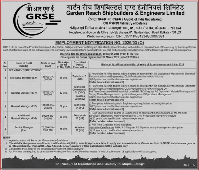 GRSE Recruitment 2026: Garden Reach Shipbuilders & Engineers Limited (GRSE), a Premier Schedule-A Mini Ratna Category-I Defence Shipyard under the Ministry of Defence, has released an official employment notification (No. 2026/03 (O)) for various senior-level permanent positions.