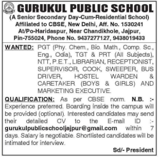 Key details for Gurukul Public School Recruitment Jajpur