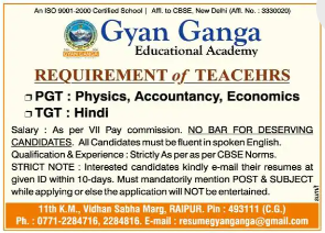 Gyan Ganga Educational Academy, a reputed ISO 9001-2000 certified school affiliated with CBSE, New Delhi, has announced new vacancies for teaching positions at its Raipur campus. This is an excellent opportunity for educators looking for a job in Raipur within a professional academic environment.