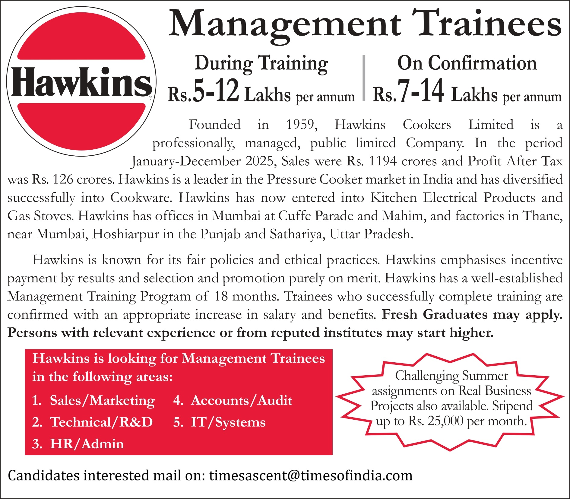 4. Does the company offer internships for current students? Yes, as part of the Hawkins Management Trainee Recruitment outreach, the company offers summer assignments on real-time business projects with a stipend of up to ₹25,000 per month.