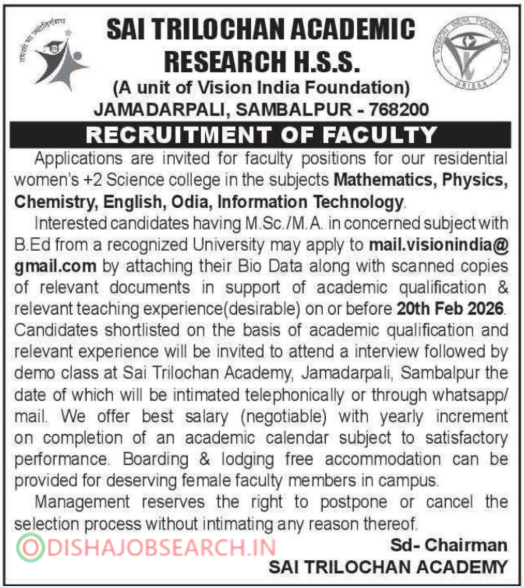 Teaching Job in Sambalpur Sai Trilochan Academic Research 2026: Are you an educator looking to make a difference in a residential academic environment? Sai Trilochan Academic Research H.S.S. (Vision India Foundation) has announced several vacancies for its Women’s +2 Science College. If you have been searching for a stable teaching job in Sambalpur, this could be your next big career move.