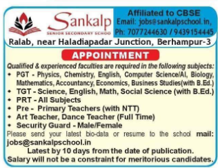 Vacancy details for Recruitment at Sankalp Senior Secondary School Berhampur