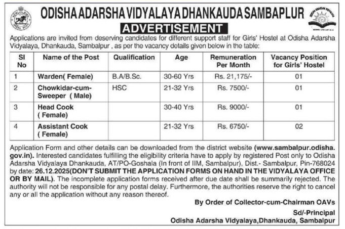Engagement of various support staff positions for the Girls’ Hostel at Odisha Adarsha Vidyalaya, Dhankauda, Sambalpur.