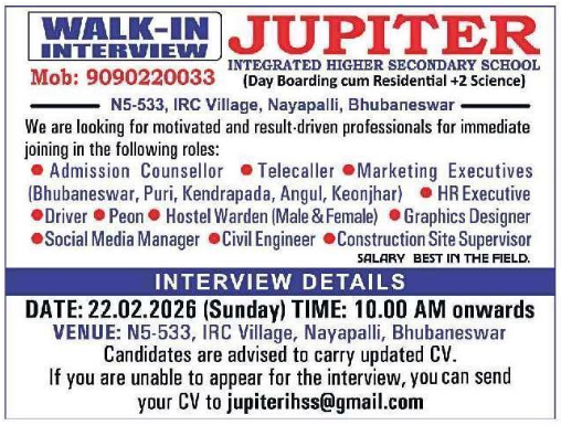 Jupiter School Bhubaneswar Recruitment 2026: Are you looking for a rewarding career in the education sector? Jupiter Integrated Higher Secondary School, a premier day-boarding and residential +2 Science institution in Odisha, has announced a massive walk-in drive for various professional roles.