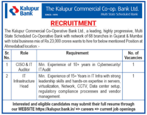 Kalupur Commercial Co-Operative Bank Recruitment 2026: The Kalupur Commercial Co-Operative Bank Ltd., a leading Multi-State Scheduled Co-Operative Bank with a network of 68 branches across Gujarat and Mumbai, has announced new job openings. The bank is looking to hire experienced professionals for key IT positions at its Ahmedabad location.