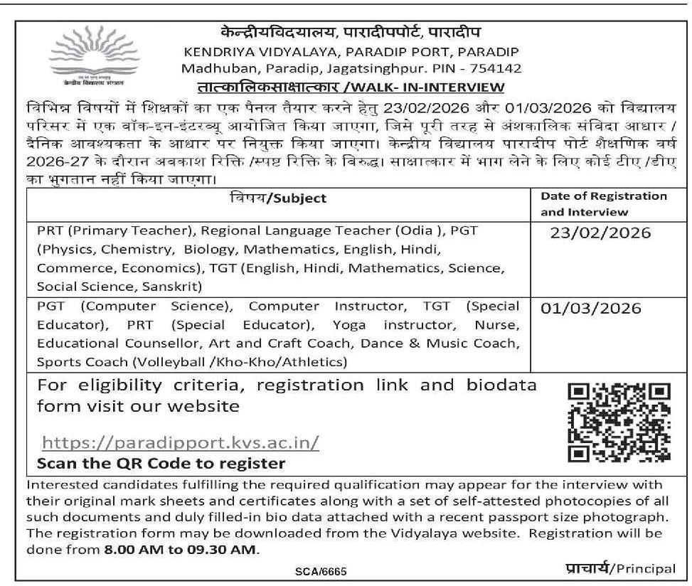 Career Opportunity: Walk-In Interviews at Kendriya Vidyalaya, Paradip Port (2026-27)