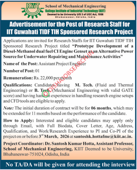KIIT Recruitment 2026: The School of Mechanical Engineering at KIIT Deemed to be University, Bhubaneswar, has announced a recruitment drive for a research-focused role. This position is part of a prestigious project sponsored by IIT Guwahati TIDF TIH, focusing on innovative dual-fuel engine technology for underwater applications.