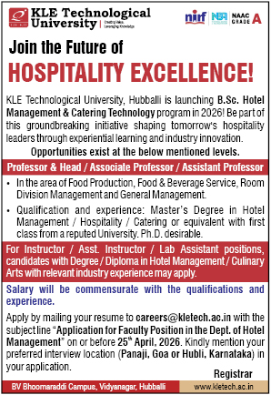 Recruitment at KLE Technological University 2026: Join the Dept. of Hotel Management