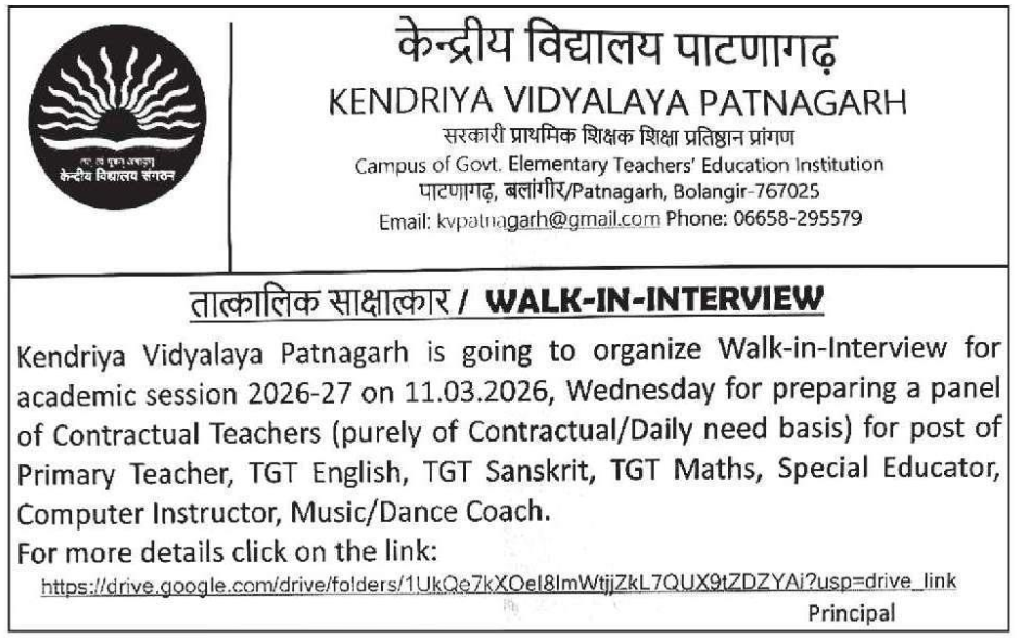 Career Opportunity: Walk-in-Interview at Kendriya Vidyalaya Patnagarh (Academic Session 2026-27)