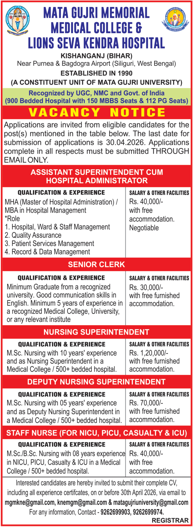 Mata Gujri Memorial Medical College Recruitment 2026: Mata Gujri Memorial Medical College & Lions Seva Kendra Hospital, a constituent unit of Mata Gujri University located in Kishanganj, Bihar, has issued a vacancy notice for several administrative and nursing positions. Established in 1990 and recognized by the UGC and NMC, this 900-bedded hospital is seeking eligible candidates to join its team.