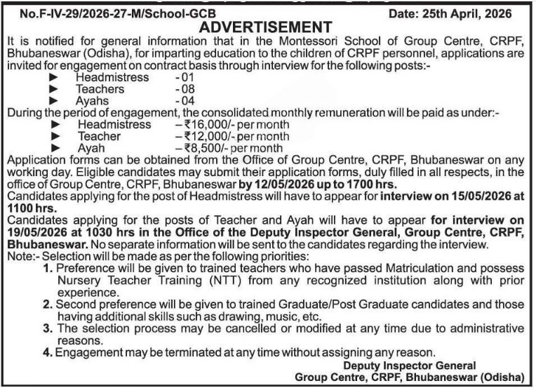 Montessori School CRPF Bhubaneswar Recruitment 2026: The Montessori School of Group Centre, CRPF, Bhubaneswar has released an official advertisement for the recruitment of staff members on a contractual basis. This engagement is specifically for imparting education to the children of CRPF personnel. Eligible candidates are invited to participate in the selection process through a direct interview.