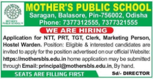 Mother’s Public School Balasore Recruitment 2026: Mother’s Public School, located in Saragan, Balasore, has announced new job openings for various teaching and non-teaching positions. Eligible and interested candidates are invited to apply for these vacancies to join a dedicated educational team in Odisha.