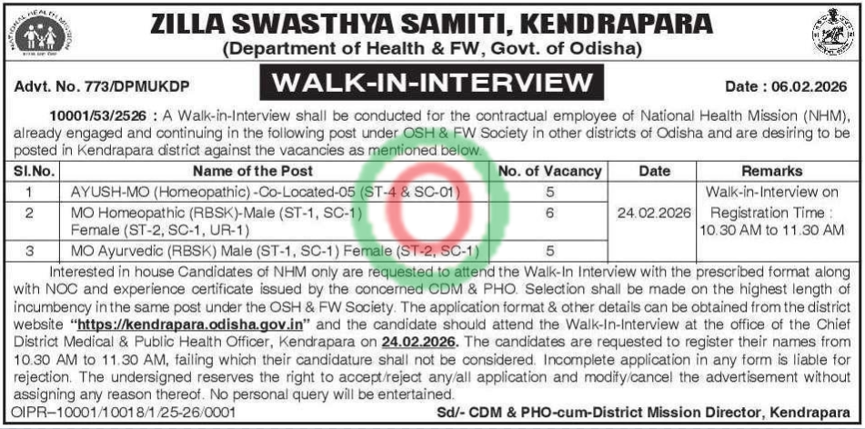 - Attend the walk-in interview on Feb 24, 2026, at the CDM & PHO office, Kendrapara.