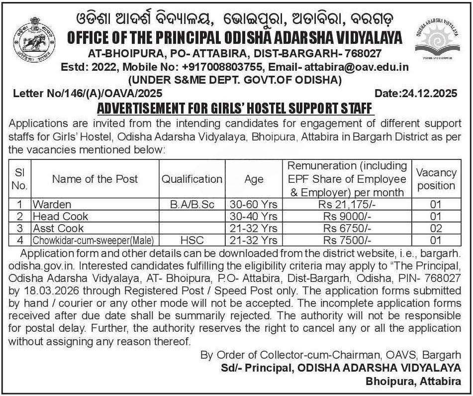 OAV Bargrah Recruitment 2026: Odisha Adarsha Vidyalaya (OAV), Bhoipura, located in the Attabira block of Bargarh district, has released an official advertisement for the recruitment of various Girls’ Hostel Support Staff positions. This is a great opportunity for local candidates looking for engagement in a government-managed educational environment.