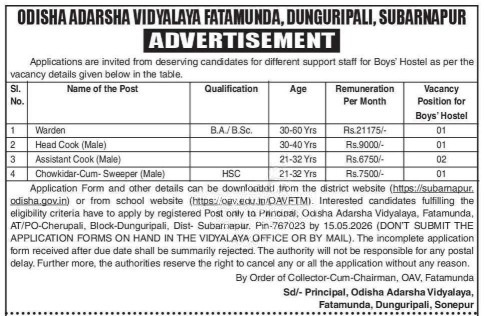 OAV Fatamunda Subarnapur Recruitment 2026: Odisha Adarsha Vidyalaya (OAV), Fatamunda, Subarnapur has released an official recruitment notification for various support staff positions for the Boys’ Hostel. Interested and eligible candidates can apply via registered post before the deadline.