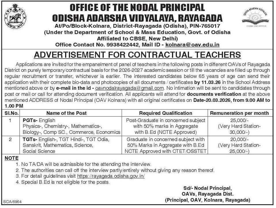 OAV Rayagada Recruitment 2026: The Office of the Nodal Principal, Odisha Adarsha Vidyalaya (OAV), Rayagada has released an official advertisement for the recruitment of teachers on a purely contractual/temporary basis for the 2026-2027 academic session.
