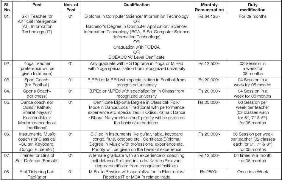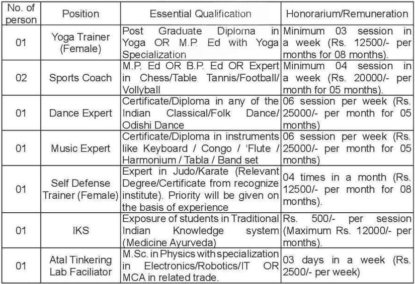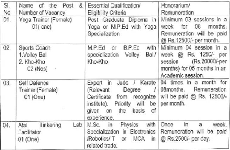 Sports Teacher/Coach (Basketball & Handball) | 02 | Bachelor’s Degree in Physical Education or equivalent from a recognized University/Institute. Experience preferred. | ₹20,000/- per month (for 05 months) |