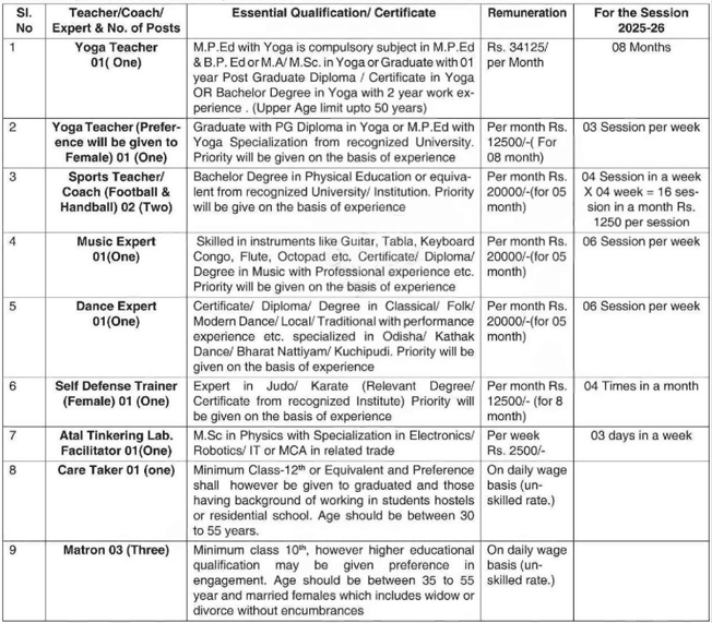 - Roles: Matron (03 Posts, Female, Minimum Class X), Sports Coach for Hockey and Chess.