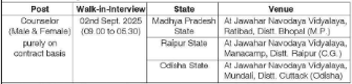 RECRUITMENT OF COUNSELLOR AT JNV OF ODISHA, MADHYA PRADESH & CHHATTISGARH. Walk-in-interview on 2.09.2025
