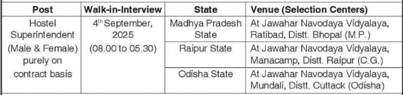 RECRUITMENT OF HOSTEL SUPERINTENDENT AT JNV OF ODISHA, MADHYA PRADESH & CHHATTISGARH. Walk-in-interview on 4.09.2025