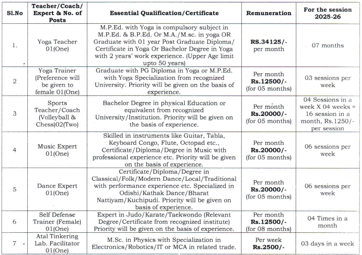 PM SHRI School, Jawahar Navodaya Vidyalaya, Khatiguda, Nabarangpur (Odisha) invites applications from qualified and experienced teachers/experts purely on part-time/contractual basis for the academic session 2025–26 under the PM SHRI Scheme.