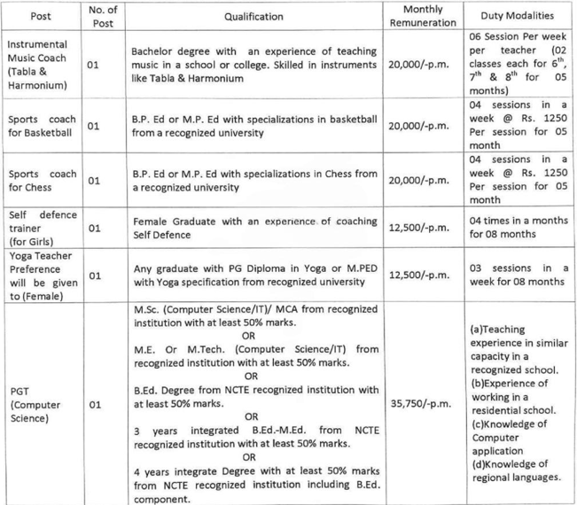 No. of post | (1) PGT- Chemistry (2) PGT- Physics (3) PGT-CS(IT) (4)TGT – Eng (5) TGT – Hindi (6) TGT – Social Sc (7) TGT- Computer Science (8) TGT- PET (Male) (9) Yoga Teacher (10) Yoga Trainer (11) Sports Coach (12) Dance Expert (13) Music Expert (14) Self Defense Trainer (Female) |