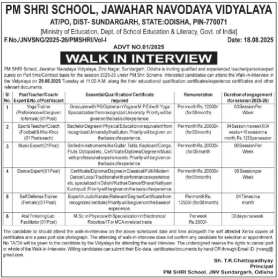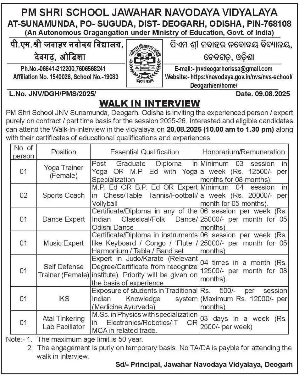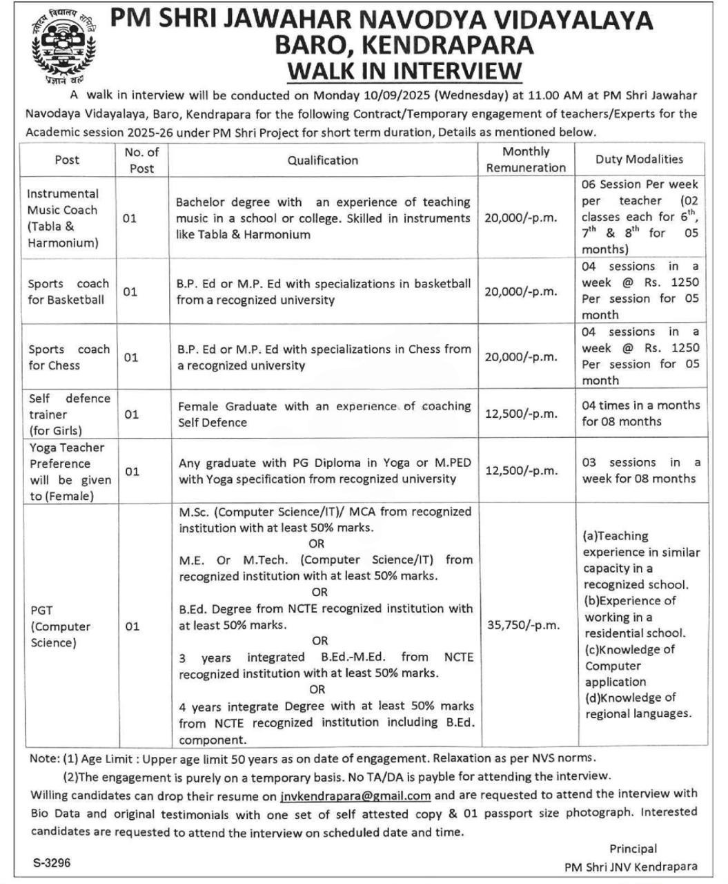 A walk-in interview will be held on Wednesday, 10.09.2025 at 11:00 AM at PM Shri Jawahar Navodaya Vidyalaya, Baro, Kendrapara for the engagement of Teachers/Experts on Contractual/Temporary basis for the Academic Session 2025-26 under the PM SHRI Project for a short-term duration.