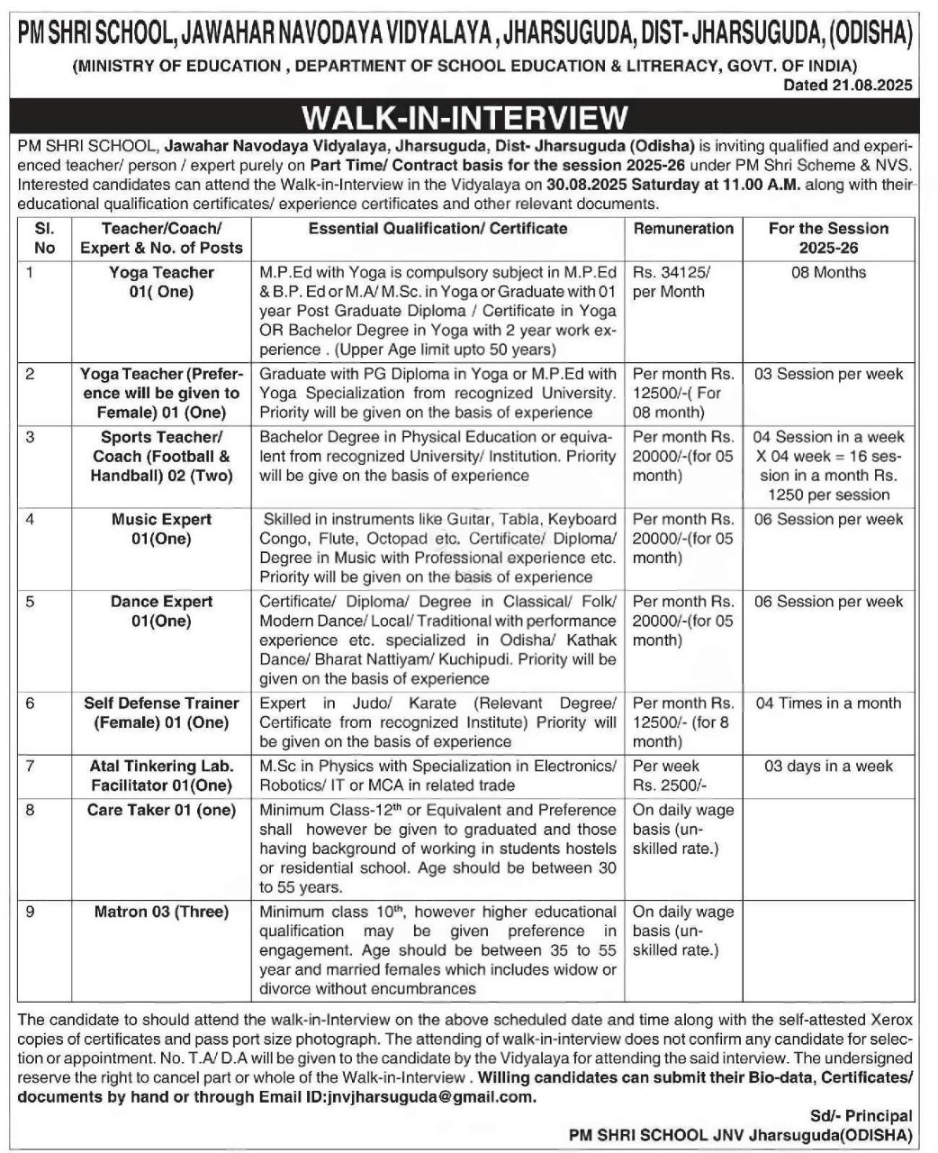 JNV/ Odisha Navodaya Vidyalaya Recruitment Jharsuguda. Walk-in-interview on August 30, 2025