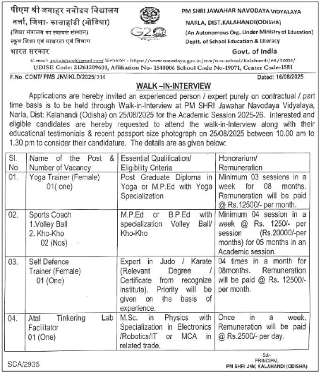 JNV/ Odisha Navodaya Vidyalaya Recruitment Narla, Kalahandi. Walk-in-interview on August 25, 2025