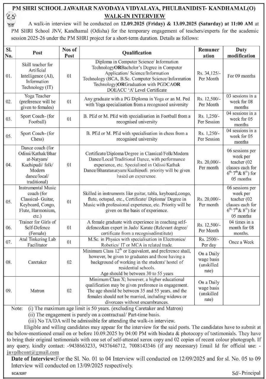 JNV/ Odisha Navodaya Vidyalaya Recruitment Kandhamal. Walk-in-interview on 12.09.2025 (Friday) & 13.09.2025 (Saturday)