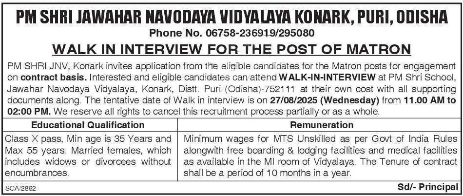 PM SHRI SCHOOL JAWAHAR NAVODAYA VIDYALAYA Narla, Kalahandi, Odisha is going to conduct Walk-in-interview for the engagement of Matron on contractual basis on 06/08/2025 for the Academic Session 2025-26. All the eligible candidates are hereby requested to attend the walk-in-interview along with their educational testimonials on 06/08/2025 between 10.00am to 3.00pm to consider their candidature.