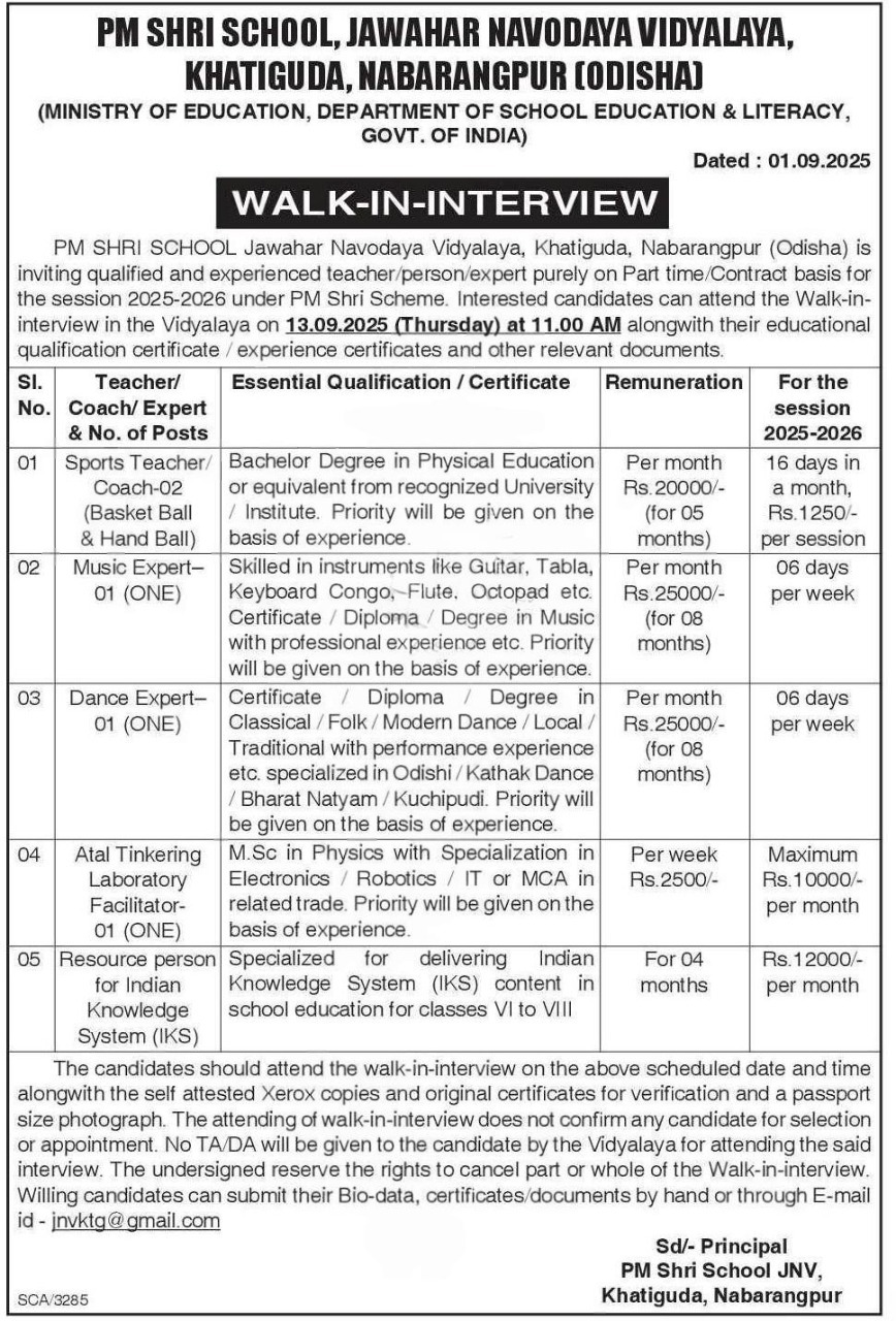 PM SHRI School, Jawahar Navodaya Vidyalaya, Khatiguda, Nabarangpur (Odisha) invites applications from qualified and experienced teachers/experts purely on part-time/contractual basis for the academic session 2025–26 under the PM SHRI Scheme.