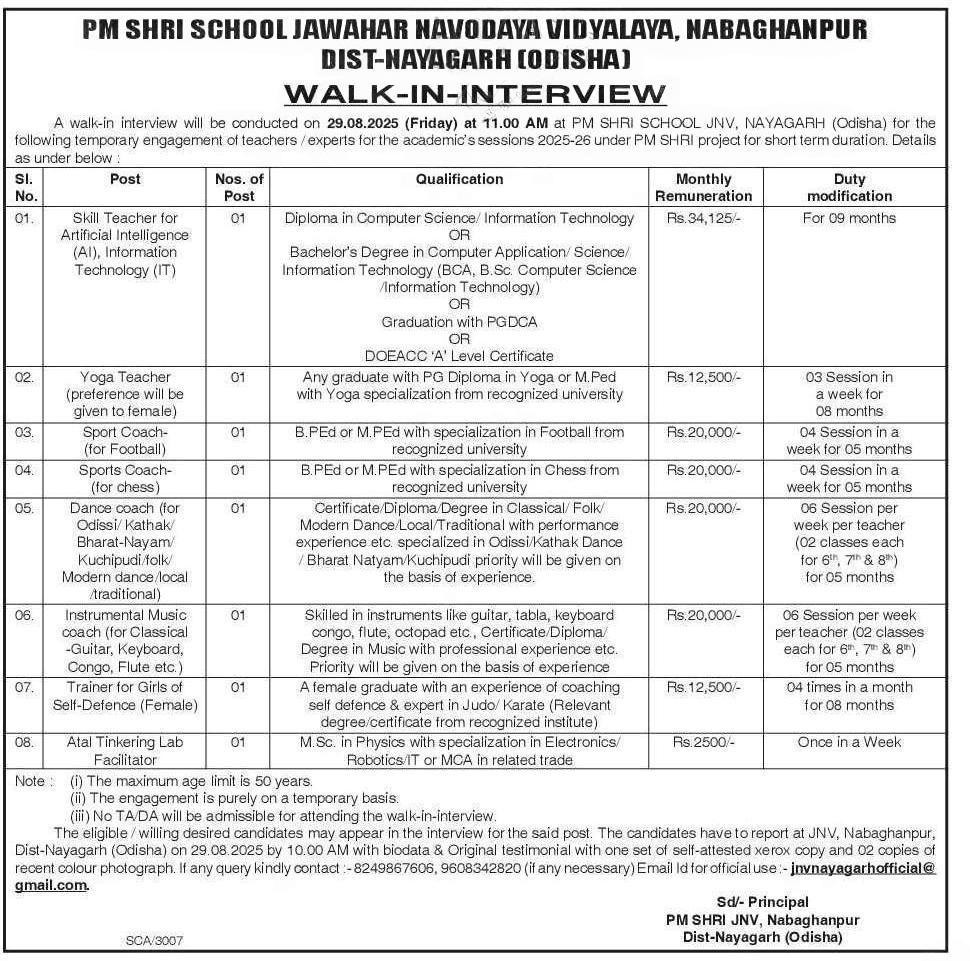 JNV/ Odisha Navodaya Vidyalaya Recruitment Nabaghanpur, Nayagarh. Walk-in-interview on August 29, 2025